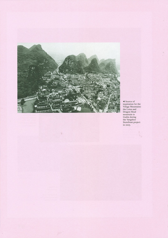 However, before the Biennale we were already working on mixing mountains and agriculture with urbanism during our Yangshuo Storefront project; we built a small storefront among the mountains. I think this was the first time that we were inspired to discover how someone can live around, among, and inside the mountains and how we could merge these findings with our urban imagination. It was the most Chinese land-scape that was the inspiration, the first step-that's how the inspiration came to us.