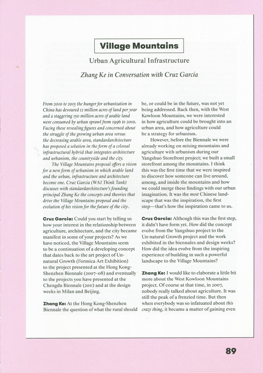 The Village Mountains proposal offers a vision for a new form of urbanism in which arable land and the urban, infrastructure and architecture become one. Cruz Garcia (WAI Think Tank) discusses with standardarchitecture's founding principal Zhang Ke the concepts and theories that drive the Village Mountains proposal and the evolution of his vision for the future of the city.