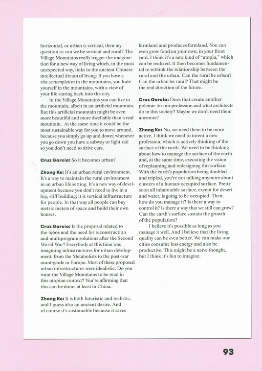 Cruz Garcia: Is the proposal related to the 1960s and the need for reconstruction and multiprogram solutions after the Second World War? Everybody at this time was imagining infrastructures for urban development: from the Metabolists to the post-war avant-garde in Europe. Most of these proposed urban infrastructures were idealistic. Do you want the Village Mountains to be read in this utopian context? You're affirming that this can be done, at least in China.