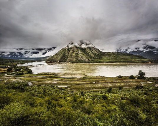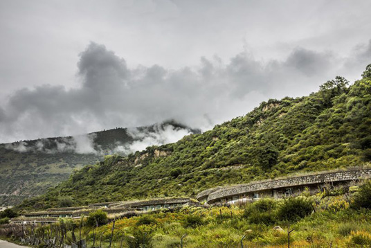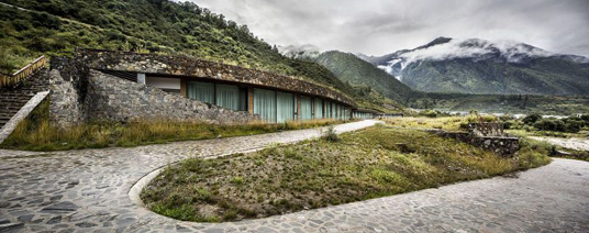 The hostel is situated along the slope of the Yarlung Tsangpo River near Pai Town, the small locality that marks the entrance to the Grand Canyon. The site is facing the river to the north, the 7,782 m-high peak of Namcha Barwa to the east, the 7,294 m Gyala Peri Peak to the northeast, and Mount Duoxiongla to the south. To design a hostel with one hundred rooms in such an environment posed a great challenge for the architects. Inspired by the “steps” strategy often seen in local villages when built on slopes, they decided to design a series of stepped, single-storey, linear buildings, each with unimpeded views of the river and mountains to the north and east. On four steps, each set back and grouped in a cresent-shaped form, the building is integrated like a horizontal cut in the foot of the mountain. With roofs covered by earth, shrubs and rocks, the building gently embeds itself into the sloped landscape. Viewed from a distance, the hostel disappears like a few thin leaves floating along the river.