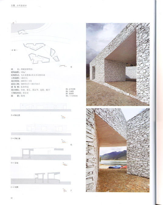 公路切断了河滩和山体的联系。于是,如何把一个孤立场地和它周围的环境重新联系起来成为这个设计的首要问题。从平面上看,建筑的外轮廓,在西、北两面以直线的方式朝向开阔的河谷;东南面以一条连续的折线呼应公路的走向和山体的转折。而建筑内部空间的轮廓是从外轮廓包裹的不规则形体中“切割”出来的。内部空间以—个不规则四边形庭院为中心,连接了建筑的4个开口,呼应了景观朝向和流线安排。 “切割”剩下的室内空间分别容纳建筑的3部分功能——售票、漂流活动更衣室和卫生间。这个看似随意的平面实际上是被流线、功能和场地条件限定的结果。形体和空间的几何特征把建筑和环境联系起来。