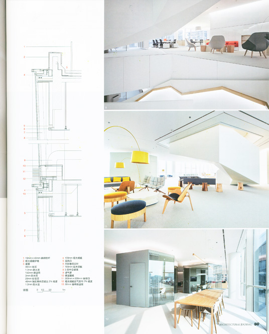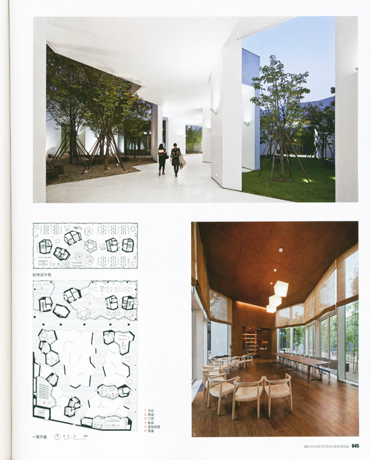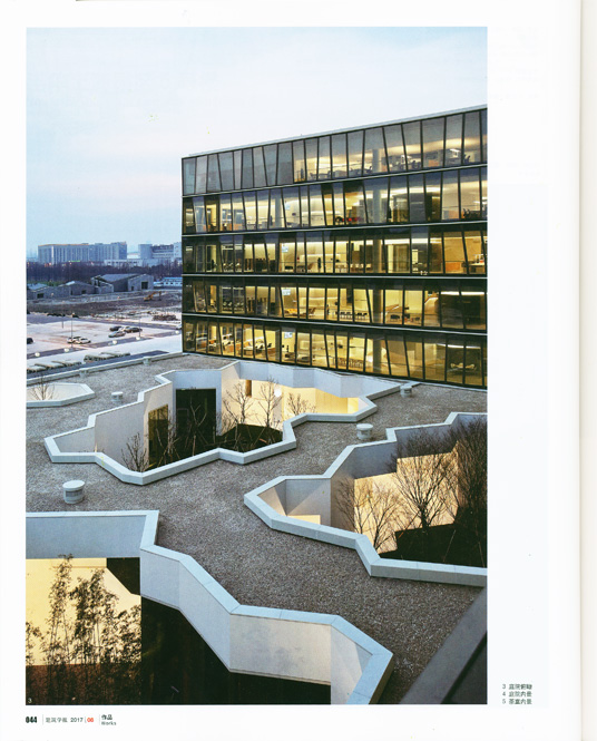 源于有机网格的5 个位于地面层的花园,遵循着整个建筑的基本空间构成模式,诠释了中国传统园林的内向性本质。在办公室内,这种空间构成模式又通过在透明立面围合的大空间中的5 个不规则核心筒反向地表现出来。通过这种图与底的置换,内向的中国园林成为了开放的当代办公空间,位于顶层的另一系列开放庭院则与地面层的花园相互呼应。