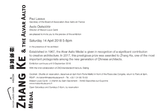 On the occasion of the exhibition Alvar Aalto, architecte et designer at the Cité de l’architecture et du patrimoine in Paris (9 March-1 July 2018), Maison Louis Carré organizes an exhibition focusing on the Alvar Aalto Medal and its newest laureate, the Chinese architect Zhang Ke.