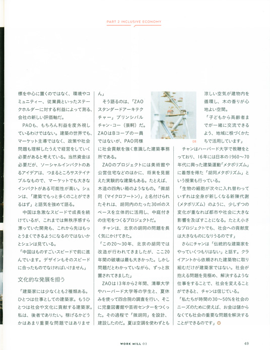 そう語るのは、「ZAOスタンダ一ドア一キテクチャ一」プリンシパルチャン·コ一(張軻) だ。ZAOはBコ一プの一員ではないが、PAO同様に社会貢献を強く意識した建築事務所である。