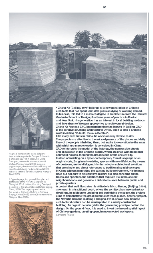 Zhang Ke (Pechino, 1970) è parte di quella nuova generazione di architetti cinesi che ha trascorso un periodo di formazione e/o di lavoro all’estero – nel suo caso per la laurea magistrale alla Harvard GSD e tre anni di pratica tra Boston e New York – e che lega un interesse per tradizioni costruttive locali ad approcci occidentali alla progettazione. Come molte delle nuove pratiche in Cina, il suo lavoro guarda a scale molto diverse: i progetti sono attenti alle micro-dinamiche dei luoghi e alla vita quotidiana delle persone che li abitano, ma ambiscono anche a rivoluzionare le modalità con cui si concepisce la rigenerazione urbana in Cina.