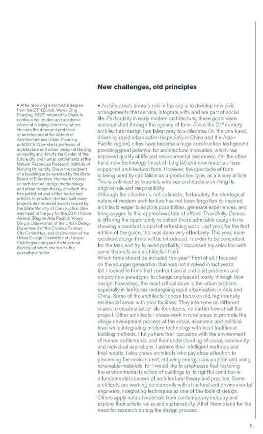 Uno dei progetti che meglio rappresenta questa attitudine è Micro Hutong (2016), un intervento su una delle tradizionali corti di Pechino in cui l’architetto cinese inserisce dei micro-alloggi. Oltre che aggiornare e ottimizzare gli spazi, il progetto ha come obiettivo mostrare le grandi potenzialità di questi luoghi. L’edificio 5 del Campus Novartis, completato a Shanghai nel 2016, è invece la dimostrazione di come la cultura architettonica cinese possa essere reinterpretata in un edificio di nuova costruzione. Una griglia organica è il principio generatore con cui è stato disegnato tutto il progetto che, al piano terra, inverte il pattern spaziale dei tradizionali giardini cinesi creando ambienti di lavoro aperti e interconnessi.