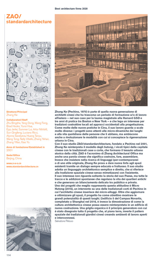 Con il suo studio ZAO/standardarchitecture, fondato a Pechino nel 2001, Zhang Ke reinterpreta il modello degli hutong, i vicoli tipici della capitale cinese con le tradizionali case a corte, che formano il tessuto urbano storico della città. ZAO è l’acronimo di Zhang Architectural Office ma anche una parola cinese che significa costruire, fare, assemblare. Invece che insistere nella ricerca di linguaggi iper-contemporanei di uno stile originale, Zhang Ke prova a dare nuova linfa agli spazi esistenti tramite un dialogo sempre educato e fruttuoso. Il suo studio adotta un linguaggio architettonico semplice e diretto, che si riferisce alla tradizione spaziale cinese senza mimetizzarsi con l’esistente.