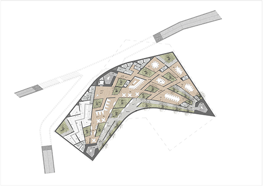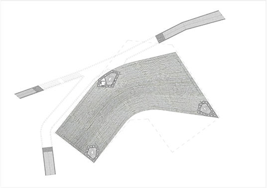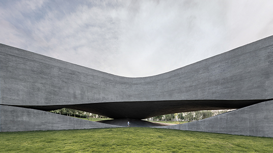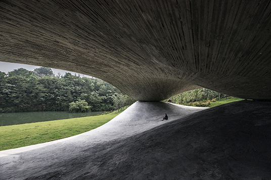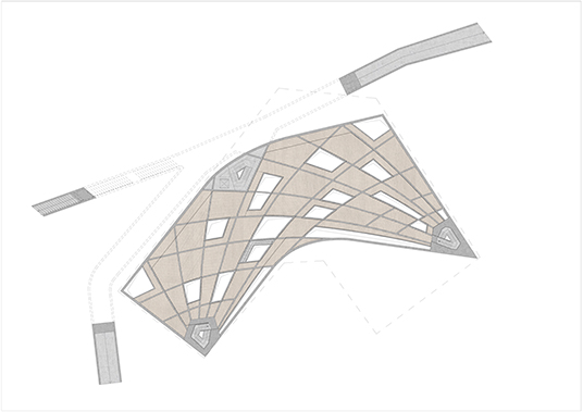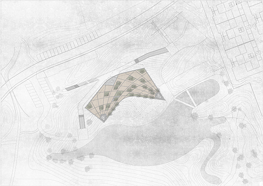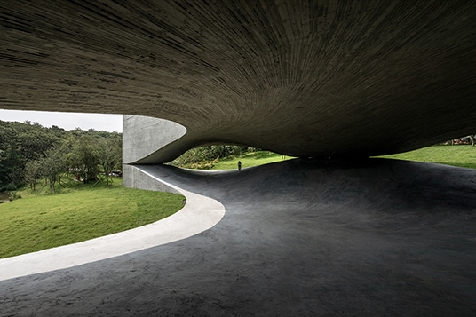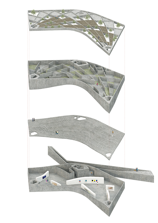 建筑的上层和下层空间之间是三维形态的室外空间,通过透镜状的切口向四面开放,延申到舒缓的草坡景观之中。此空间将用于室外电影放映或戏剧表演。社区艺术中心的展览职能由建筑底层的室内空间承担,该空间埋入草坡之下,空间中仅由必要的结构元素相互分隔,由建筑周边草坪中的混凝土缓坡向下进入。