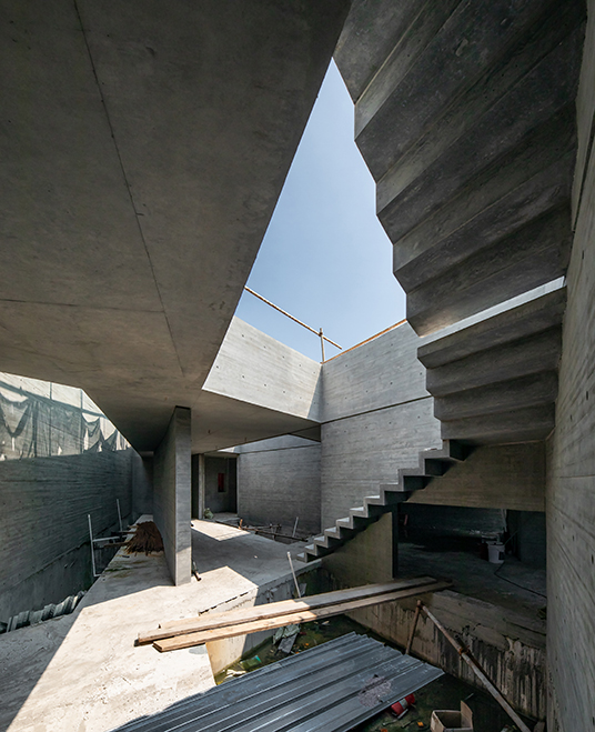 建筑的上层和下层的连接部分为楼梯空间,在结构上,上下相交的部分留出了一条窄缝,进一步暗示了建筑形体的上下两个独立部分,同时在混凝土浇筑的楼梯间内渗透进了一抹草地的亮色。