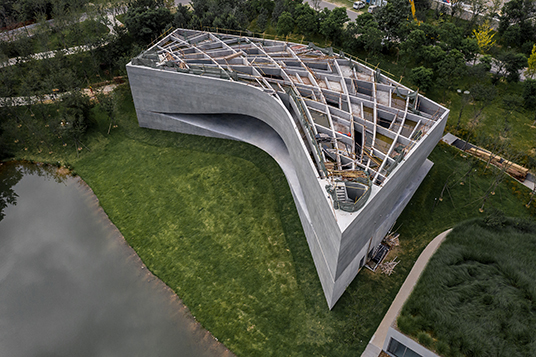 社区艺术中心镶嵌在一片坡地景观中,旁边有一个小湖,建筑在剖面上以起伏的姿态呼应了周围的大地形态。建筑的结构系统由弯曲的混凝土梁网组成,建筑物的上层部分由平面上三个角落的结构锚固于底层的混凝土坡上。 上层与外界封闭,其交叉的混凝土梁网将空间自然分割成梯形的小空间,室内与室外交错,形成迷宫般的园林景观空间。 在无障碍屋顶上可欣赏风景。