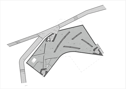 The ensemble is embedded in a hilly landscape with a small lake and makes reference to it with its curved form. The construction system consists of a curved mesh of concrete beams that support the upper part of the building on three corners. The upper storey is closed to the outside and forms a labyrinthine interior landscape along with trapezoidal courtyards and spaces. The accessible roof provides a view of the landscape.