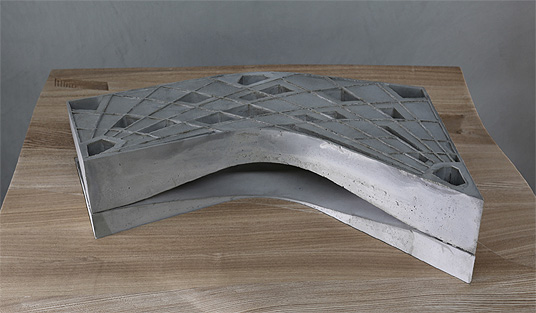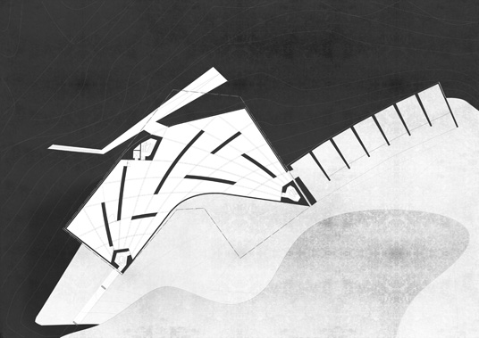 The ensemble is embedded in a hilly landscape with a small lake and makes reference to it with its curved form. The construction system consists of a curved mesh of concrete beams that support the upper part of the building on three corners. The upper storey is closed to the outside and forms a labyrinthine interior landscape along with trapezoidal courtyards and spaces. The accessible roof provides a view of the landscape.