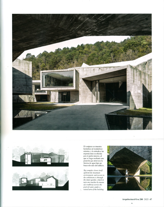 The complex closes itself off from the mountain environment, and access to the exhibitions is through the inner garden, which in turn one reaches by means of a walkway across the pool of water, under a raised arm of the building.
